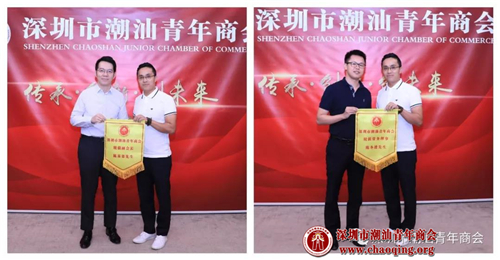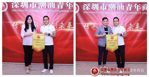 9月份轮值会长卓睿为9月份轮值副会长许嘉子(左)、黄宇宁(右)授旗
