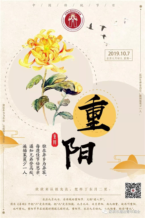 重阳节,又称重九节、晒秋节、“踏秋”,中国传统节日。庆祝重阳节一般会包括出游赏秋、登高远眺、观赏菊花、遍插茱萸、吃重阳糕、饮菊花酒等活动。每年的农历九月初九日,与除夕、清明节、中元节三节统称中国传统四大祭祖的节日。