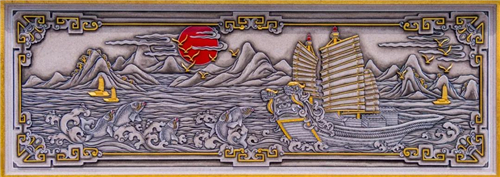 构图上则借鉴了国画与戏曲虚拟空间的手法,善于把不同时空发生的事件组织成一个完整的画面, 图案繁复,技法成熟,在形象刻划、刀法运用上趋玲珑剔透,尤其多层通雕江海水族与鱼虾蟹萎,更令人叹为观止!