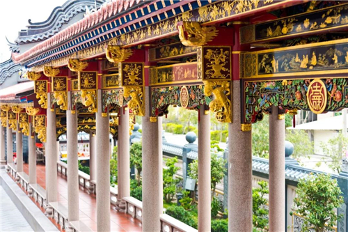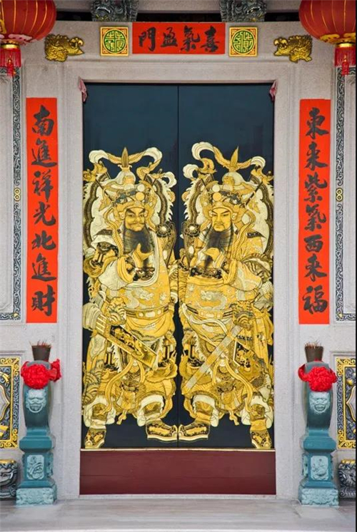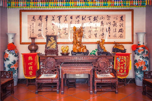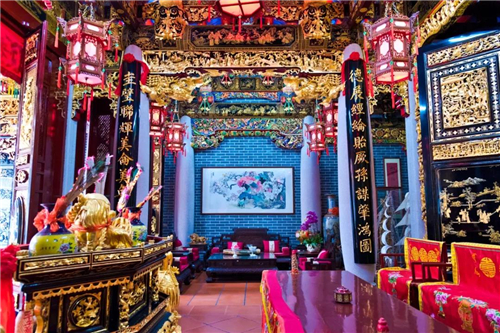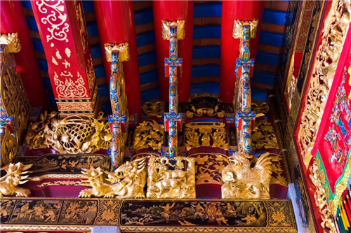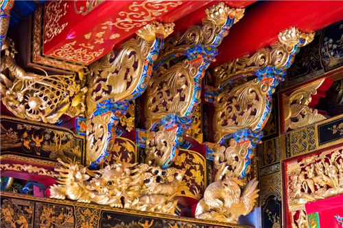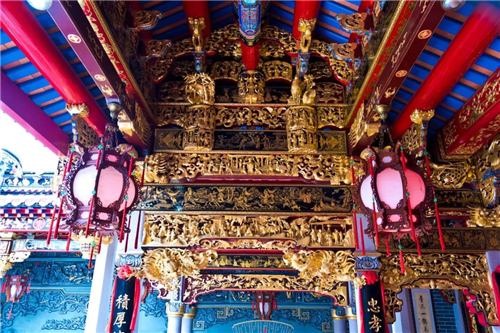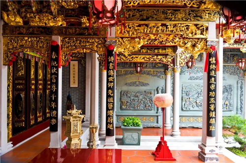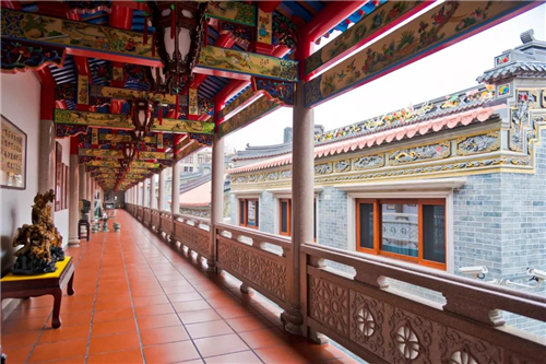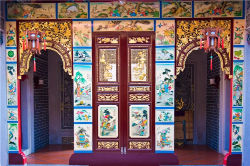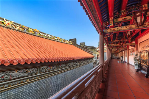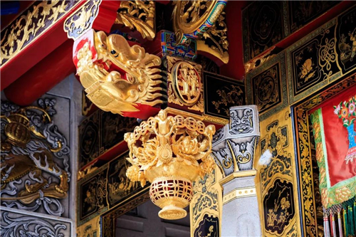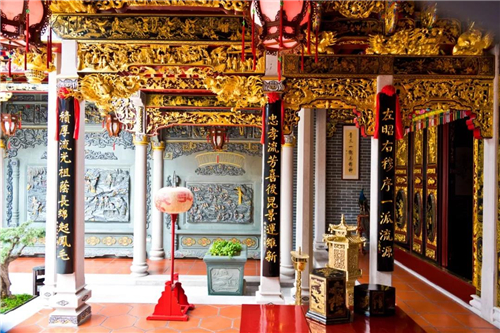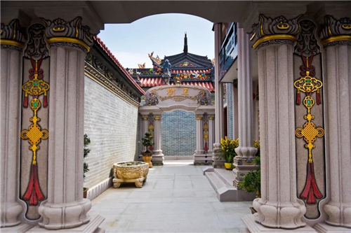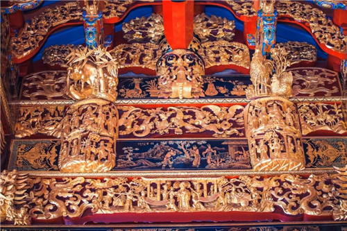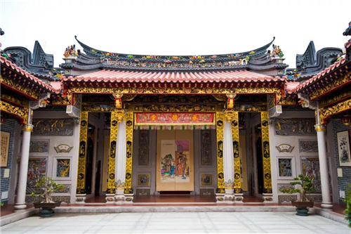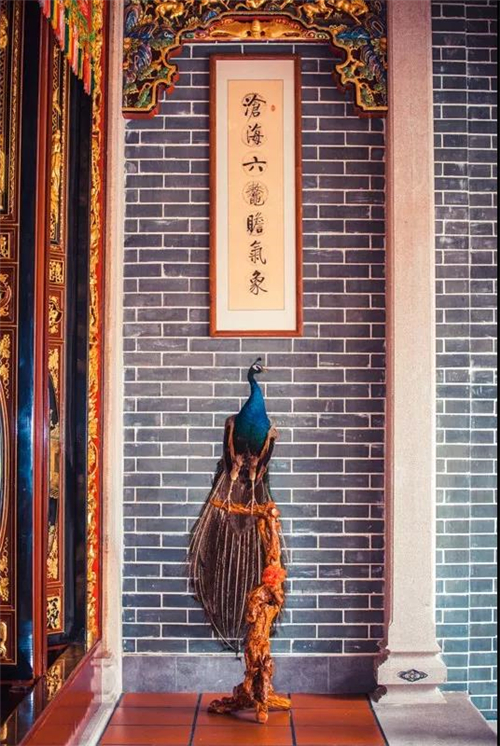 这里无论从梁架、额枋、梁桁、柱间、檐角、门窗、屏风、隔闪等的陈设和装饰中都大量采用黑漆装金、五彩装金等著名的“潮州金漆木雕”工艺。这些精美绝伦的金漆木雕装饰,每一个细部都处理得十分妥当熨贴,故虽雕梁画栋、流金溢彩但繁而不杂,满架辉煌而无俗气,精巧玲珑而不小气,显得华贵雍容,雅致多姿。