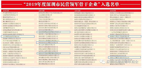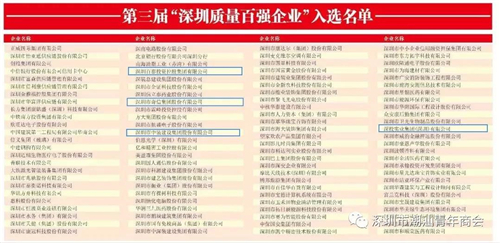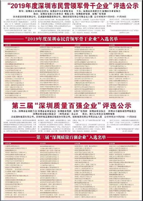 11月20日,“2019年度深圳市民营领军骨干企业”和第三届“深圳质量百强企业”评选名单在深圳特区报公示。