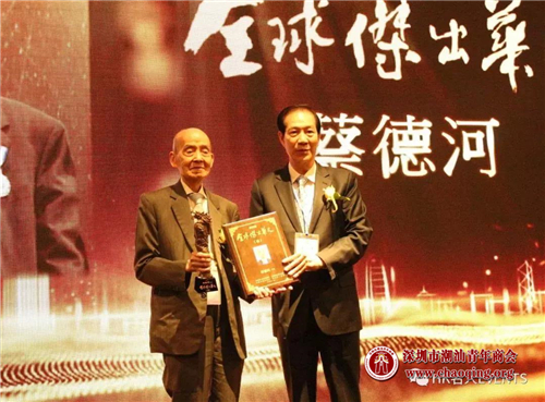 卢文端(右)向蔡德河颁发“全球杰出华人奖”