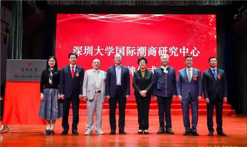 刘洪一书记、蔡立书记、李丽院长、吴开松会长、李奕标会长、林强有名誉会长、李闻海名誉会长上台为深圳大学国际潮商研究中心揭牌