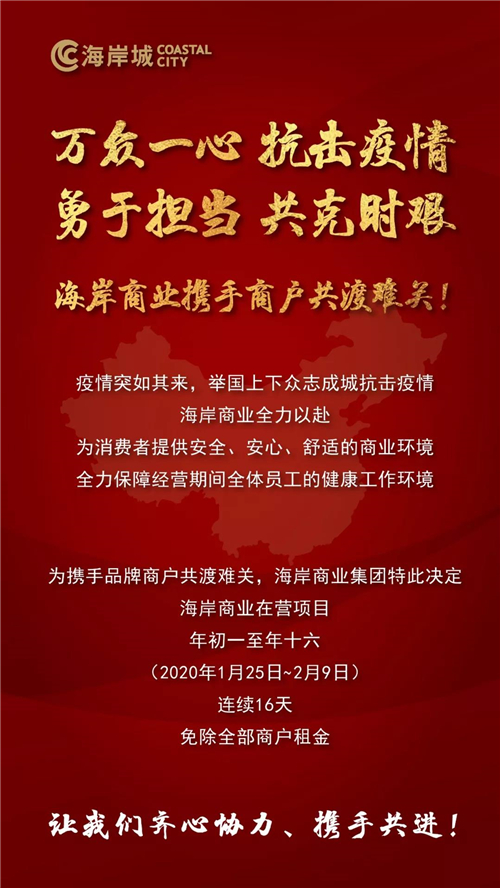 连续16天免除租金!海岸商业携手商户抗击疫情共渡难关