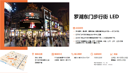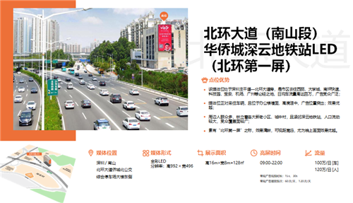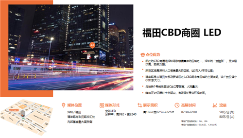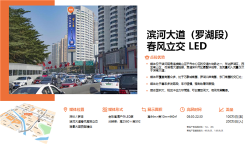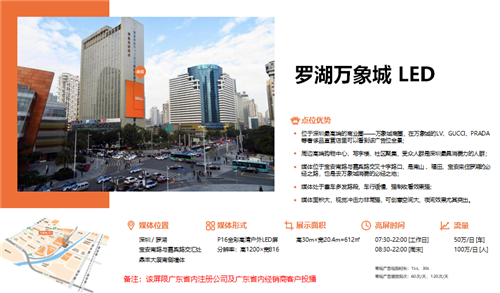户外大牌:分布六大区共计55块户外大牌,甄选城市繁华商圈和主要交通干道优质资源 ,媒体形式多样:LED,喷绘大牌,高速立柱等。现已全面覆盖东门商圈、华强北商圈、南山蛇口自贸区、前海商圈、万象城、福田CBD、车公庙商圈、龙岗中心城、水官高速、清平高速、机荷高速等深圳核心商圈及交通主要干道。总面积高达18000m²,无论从面积还是数量上,皆位居同行业前列!同时,可实现户外创意设计及人屏互动等户外媒体新玩法。