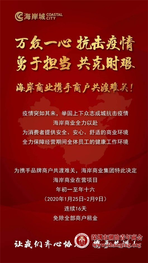 受新型冠状病毒疫情影响,春节期间各大商场和超市客流量大幅减少,商户营收大受影响。为了给予品牌商户最大的支持,缓解商户压力,经集团董事会讨论决定,海岸集团作为民营企业率先推出减租举措,与商户共度时艰,在营项目于2020年1月25日——2月9日期间对商户进行了租金减免或折让。