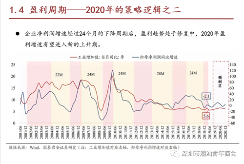庞云川表示, 2020年初“牛市起点”策略的判断逻辑有两个。一是基钦周期,预计2020年1季度左右被动去库存接近尾声,经济将进入到新一轮的扩张期。一是盈利周期,企业净利润增速经过24个月的下降周期后,盈利趋势处于修复中,2020年盈利增速有望进入新的上升期。