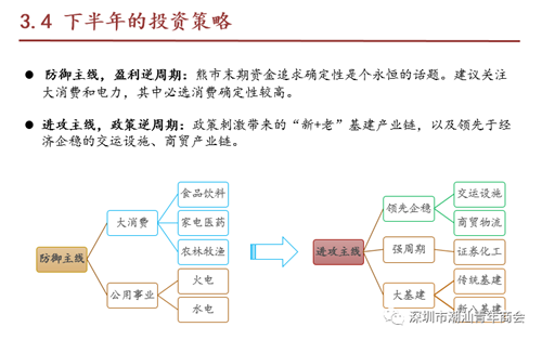 关于投资策略,庞云川建议,一防御主线,盈利逆周期:熊市末期资金追求确定性是个永恒的话题,建议关注消费和电力。二进攻主线,政策逆周期:政策刺激带来的“新+老”基建产业链,以及领先于经济企稳的交通运输设施、商贸产业链。