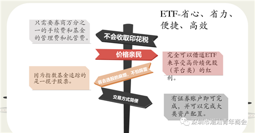 靳冰馨表示,ETF的优势还在于省心、省力、便捷、高效,适合各类投资者。她指出,第一,ETF不会收取印花税;第二,价格亲民,能借道享受高价绩优股;第三,省去选股的麻烦,不怕踩雷;第四,交易方式简便,有证券账户即可。
