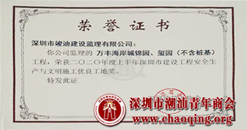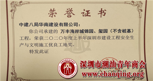 2020年4月,从深圳建筑业协会传来喜讯,通过深圳建筑业协会安全生产与文明施工优良工地工作委员会审定,本会会长单位旗下的万丰海岸城锦园、玺园(不含桩基)工程,荣获2020年度上半年深圳市建设工程安全生产与文明施工优良工地奖。