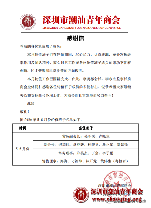 林晓义表示,通过轮值,他深深感受到秘书处工作的不易,希望轮值班子们能够积极参与商会的建设发展,乐于奉献时间,多参加各项会务工作和活动。他强调,作为潮青的一份子,大家要积极宣传、推广潮青商会这个开放共享的优质平台,推荐优秀潮籍青年入会,进一步壮大商会力量。