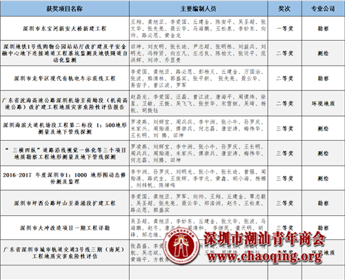 “深圳市东宝河新安大桥新建工程”获一等奖;“深圳地铁1号线购物公园站站厅改扩建及平安金融中心地下连接通道工程基坑监测及地铁隧道自动化监测”、“深圳市龙华区现代有轨电车示范线工程”、“广东省沈海高速公路深圳机场至荷坳段(机荷高速公路)改扩建工程地质灾害危险性评估报告”等3个项目获二等奖;“深圳海滨大道机场段工程第二标段 1:500地形测量及地下管线探测”、“‘三横四纵’道路沿线视觉一体化等三个项目 地质勘察工程地形测量及地下管线探测”、“2016-2017 年度深圳市1:1000 地形图动态修补测及监理”、“深圳市坪西公路坪山至葵涌段扩建工程”、“深圳市大冲改造项目一期工程详勘”、“广东省深圳市城市轨道交通3号线三期(南延)工程地质灾害危险性评估”等6个项目获三等奖。
