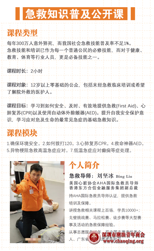 2020年7月15日下午,深圳市潮汕青年商会举办急救知识技能培训,特邀商会中共党员、美国心脏协会AHA国际急救员导师、香港东方合信金融服务集团副总裁刘坚冰先生授课,旨在增强潮青的急救知识技能,提升安全意识,护航生命安全健康。