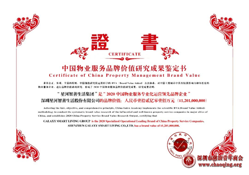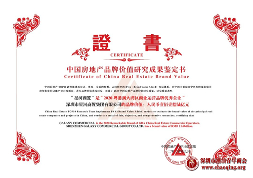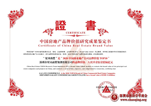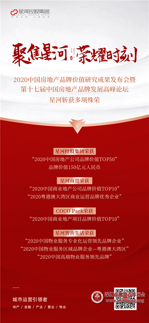 日前,由中国房地产TOP10研究组研究主办的“2020中国房地产品牌价值研究成果发布会暨第十七届中国房地产品牌发展高峰论坛”在北京隆重召开。凭借强大的综合实力及良好的企业口碑,本会荣誉会长、常务副会长、副会长单位星河控股集团荣获“2020中国房地产公司品牌价值TOP50”,品牌价值150亿元人民币;星河商置荣获“2020中国商业地产公司品牌价值TOP10”、“2020粤港澳大湾区商业运营品牌优秀企业”,COCO Park荣获“2020中国商业地产项目品牌价值TOP10”;星河智善生活荣获“2020中国物业服务专业化运营领先品牌企业”、“2020中国物业服务区域品牌企业—粤港澳大湾区”、“2020中国高端物业服务领先品牌”。