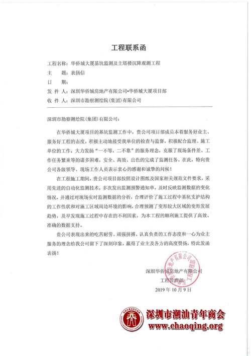 在华侨城大厦项目的监测工作中,项目部成员本着服务好业主、服务好工程的工作态度,大力发扬“一不等,二不靠”服务理念,克服了现场条件差、工作任务繁重等的诸多困难,安全、高效、出色的完成了监测任务。