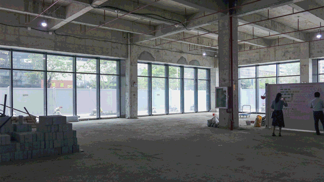 因整面玻璃墙呈弧形,每块玻璃的宽度、安装时的角度都经过精密计算。施工时,工人先在地面与木质框架上拉出弧形槽,地面设置承托玻璃的U形槽,上端木质框架上封装固定钢架。U形槽本来是直的,铺设找平层时,U形槽的控制点位置已经打好,后期根据控制点位置拉弯即可。一切准备工作停当,后期安装时,只需直接嵌入玻璃就可以了。如此,下端的U形槽托着玻璃,上端的固定钢架拉着玻璃,玻璃竖立放直,受力合理,就不容易碎裂。