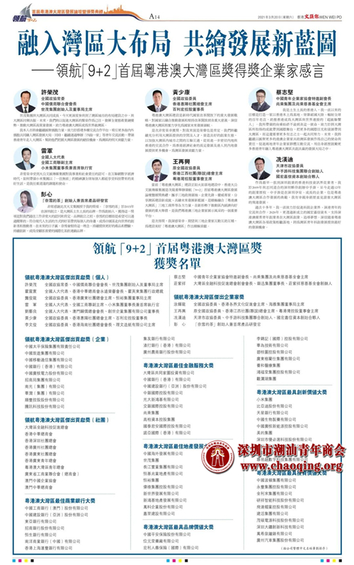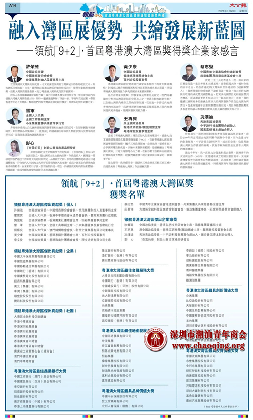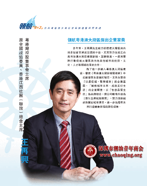 「领航『9+2』首届粤港澳大湾区发展论坛暨颁奖典礼」 于2021年3月19日举行,香港行政长官林郑月娥、中联办副主任仇鸿、驻港国安公署副署长李江舟、外交部驻港特派员公署副特派员宋如安、政制及内地事务局局长曾国卫等逾150位嘉宾出席活动。第十一、十二届全国政协委员、香港江西社团(联谊)总会主席、深圳市潮汕青年商会荣誉会长王再兴荣获「领航『9+2』首届粤港澳大湾区杰出企业家奖」。