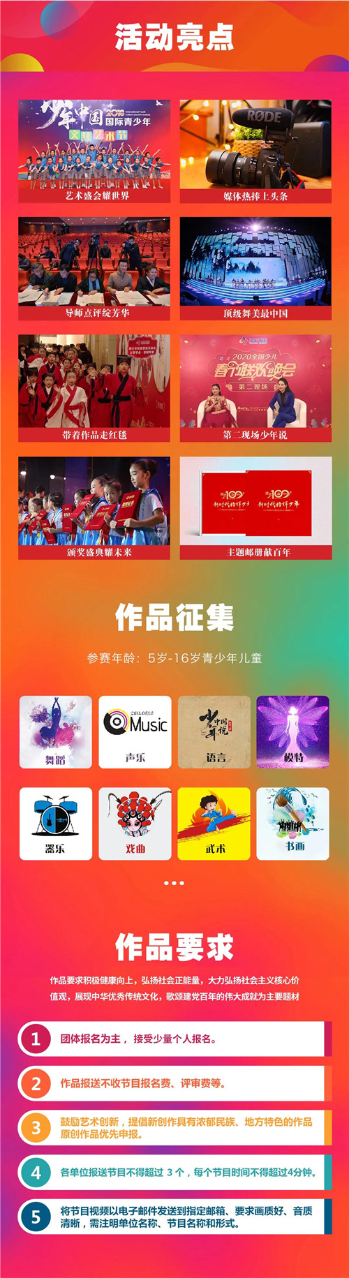 ● 内容要求健康向上、立意新颖、情感真挚,能够多角度多层次传播社会主义核心价值观和中国传统优秀文化,展示出少儿的美好生活以及未来的梦想和追求。