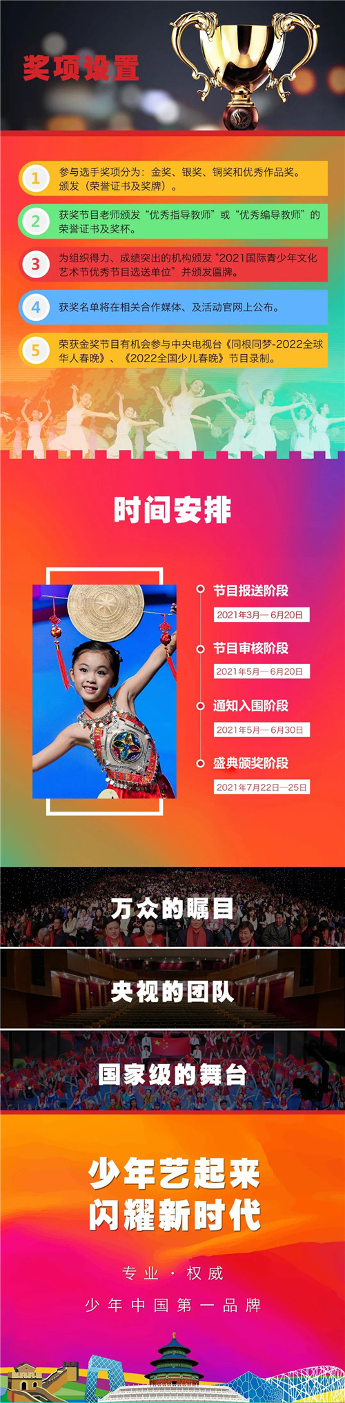 6.推送参加少年中国全国盛典金奖节目有机会参与中央电视台《同根同梦—2022全球华人春晚》、《2022全国少儿春晚》节目录制。