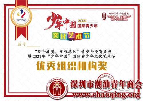 由深圳市宝安区文化广电旅游体育局指导,深圳市潮汕青年商会常务理事林小勤的单位深圳市星辰教育文化传播有限公司等承办,国际潮青联合会、深圳市潮汕青年商会等协办的“百年礼赞,星耀湾区”青少年美育盛典暨“少年中国”2021年国际青少年文化艺术节(深圳)报名开启!本次盛典由正规培训机构、中小学校、幼儿园,社区小区代表,家庭个人自行选拔优秀节目,录制成视频作品参加海选,经复选、决选专业选拔后,组织深圳展演活动并优选节目推送至北京参与总展演及颁奖盛典。