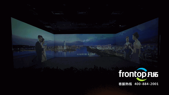 深圳首创BOX沉浸影厅,由10台投影机打造。凡拓数字配合影厅设计特点,采用景深推拉镜头和全幅全景镜头的影片镜头设计,力求达到最佳的视听沉浸感体验效果。让观者在观看地产宣传片时,“身临其境”的感受港铁物业地铁与社区的无缝连接、商业环境以及园林住宅空间。