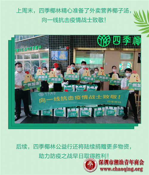 深圳市潮汕青年商会副会长黄光生的企业四季椰林于6月7日向盐田区捐赠抗疫物资若干,并在上周末向一线抗击疫情的工作人员精心准备了外卖营养椰子汤,助力抗疫之战早日取得胜利!