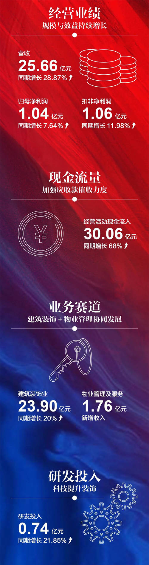 中装建设积极抓住市场机遇,推进企业深化改革,加大对科技创新的研发投入,实现业务稳健增长;同时战略协同物业管理及服务,积极开拓存量市场,物业管理服务占比进一步提升。