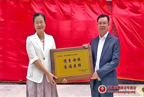 郑映微向林强有先生赠送“情系母校 造福桑梓”纪念牌匾