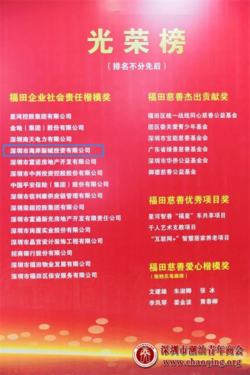 在第六个“中华慈善日”暨 “深圳慈善月”之际,福田区慈善会第三届会员代表大会暨福田慈善颁奖仪式在福田会堂举行。会上,国际潮青联合会会长、深圳市潮汕青年商会会长李奕标的单位海岸集团被授予“福田慈善企业社会责任楷模奖”。