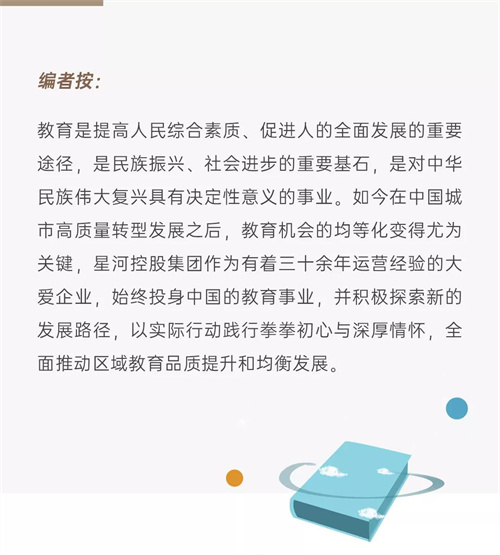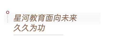 随着星河教育配套的不断扩充、教育资源的不断积淀,星河于2021年8月正式成立了教育发展中心,以全新的“星生长,河共渡”的理念,提出“学用悟贯通,身心灵康健”的育人目标。未来,教育发展中心将承担起为集团创品牌、为行业树标杆、为人民群众提供优质教育服务的使命,构建与各业务联动的新发展生态。