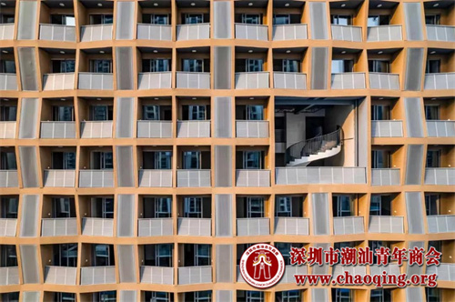 宿舍楼,用简单凹凸变化,打破立面窗格的规整节奏,阳光下,呈现出水波纹般的阴影变化。贯通二层的旋转楼梯,直接暴露于立面。