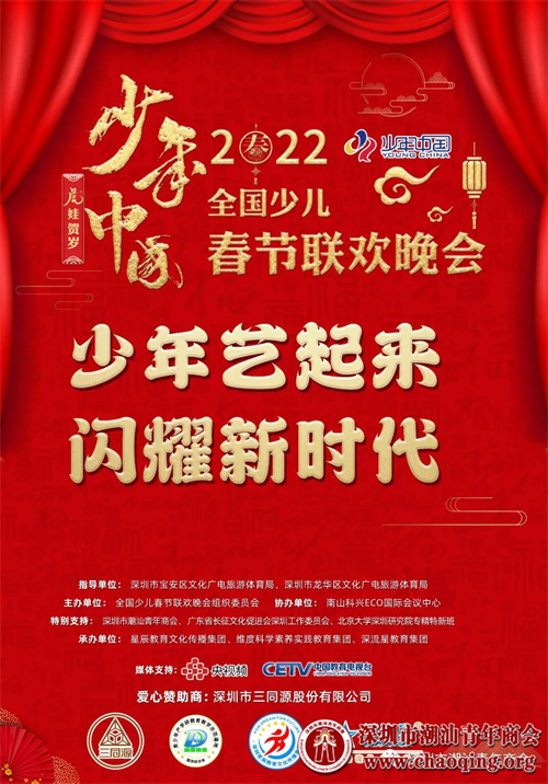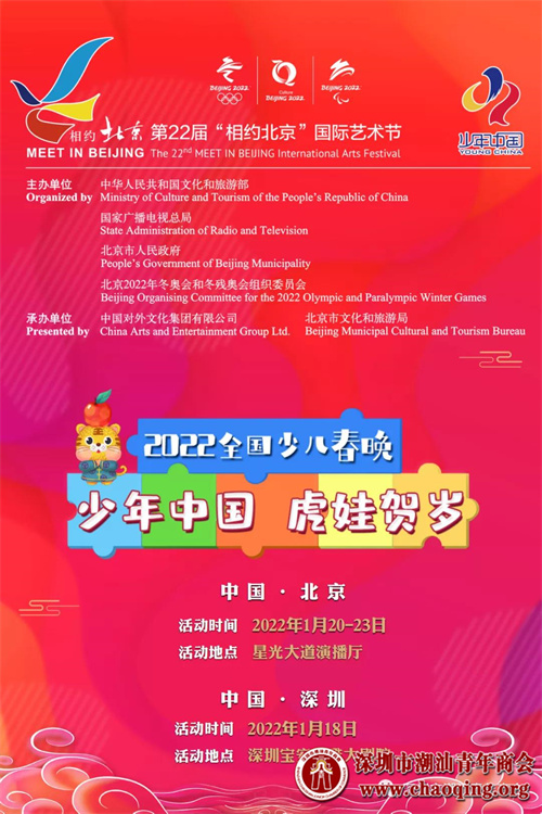 据了解,“少年中国”2022全国少儿春节联欢晚会的活动作为中华人民共和国文化和旅游部、国家广电总局、北京市人民政府、北京2022冬奥会和冬残奥会组织委员会联合主办的“相约北京”奥林匹克文化节暨第22届“相约北京”国际艺术节的重要组成部分,是助力北京冬奥会全球宣传推广,特别推出的“少年中国,虎娃贺岁”全国少儿春节联欢晚会活动之一!入选“相约北京”国际艺术节的优秀节目和选手,由北京2022冬奥会组委会颁发荣誉证书!“少年中国”全国少儿春晚深圳分会场(市选)的优秀节目,将登上北京星光大道演播厅主会场、深圳海雅大剧院分会场的录制现场。同时,优秀节目将于2022春节期间,在国家级电视台——中国教育电视台、中央广播电视总台央视频隆重播出!并在相关网络平台同步展播!深圳市潮汕青年商会作为本次活动的支持单位,在活动报名阶段积极动员“潮三代”“潮四代”踊跃报名,参与社会艺术实践活动,为展示中华文明风采,弘扬中华美育精神奉献力量!