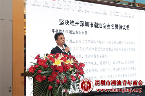 深圳市潮汕商会常务副会长、法工委执行主席陈君尧宣读了《坚决维护深圳市潮汕商会名誉倡议书》。他表示,随着商会的知名度和影响力不断增强,部分不法人士利用大众的误解,冒用商会名义从事违法活动等,我们应谴责这种侵害商会名誉行为,并呼吁大家一起共同维护商会名誉,为维护商会大家庭尽一份责任。