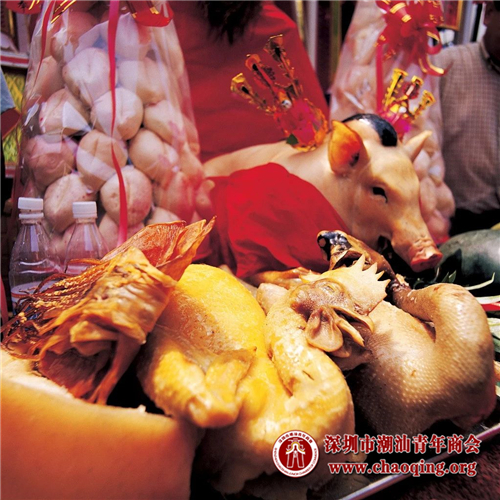 猪肉、鸡、鸭、鱼、猪肝这”五牲“是拜祭时必需的,而且摆放有讲究,最中间摆猪肉,然后左鸡、右鸭,再左鱼、右猪肝。因为潮汕近海,海鲜自古是祭祖中必不可少的供品。