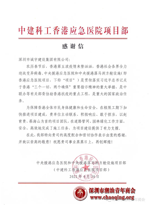 2022年农历春节后,香港第五波新冠疫情肆虐,广大香港同胞与新冠病毒艰苦作战。面对来势汹汹的第五波疫情,中央决定支援香港建设应急医院,由中建科集团承担项目建设。深圳市潮汕青年商会副会长赵育忠企业深圳市诚宇建设集团有限公司(下称:诚宇建设集团)作为参建单位之一,顺利完成了援建项目的相关建设任务。