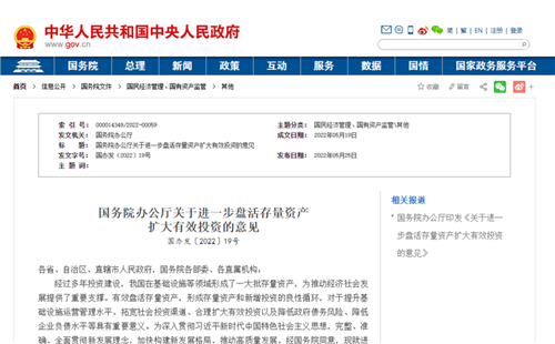 通知内容:2022年5月25日,国务院办公厅发布关于进一步盘活存量资产扩大有效投资的意见,重点内容如下: