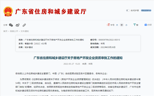 通知内容:2022年5月27日,广东省住房和城乡建设厅关于房地产开发企业资质审批工作的通知,重点内容如下: