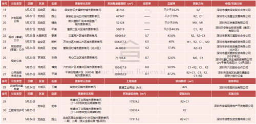 截至2022年5月29日(周日),已列入城市更新计划项目983个,拆除范围面积累计8205.9h㎡,已通过城市更新专规批复项目607个,计容建筑面积累18066.1万㎡,按数量规划通过率61.8%,按规模规划通过率55.8%,实施主体公示项目485个,拆除范围面积累计2928.4h㎡,按数量计划实施率49.3%,按规模计划实施率35.7%。