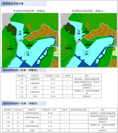 (三)调整后,1-06地块用地面积10.07公顷,规划用地性质为水域(E1),容积率“-”,备注“深圳水库”;