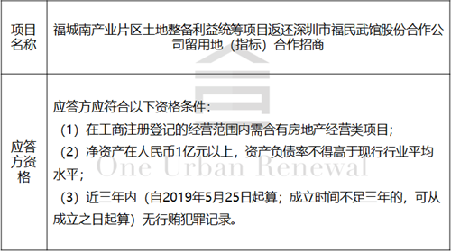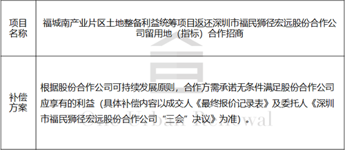 1、深圳市龙华区福城南产业片区土地整备利益统筹项目返还深圳市福民狮径宏远股份合作公司留用地(指标)合作招商公告