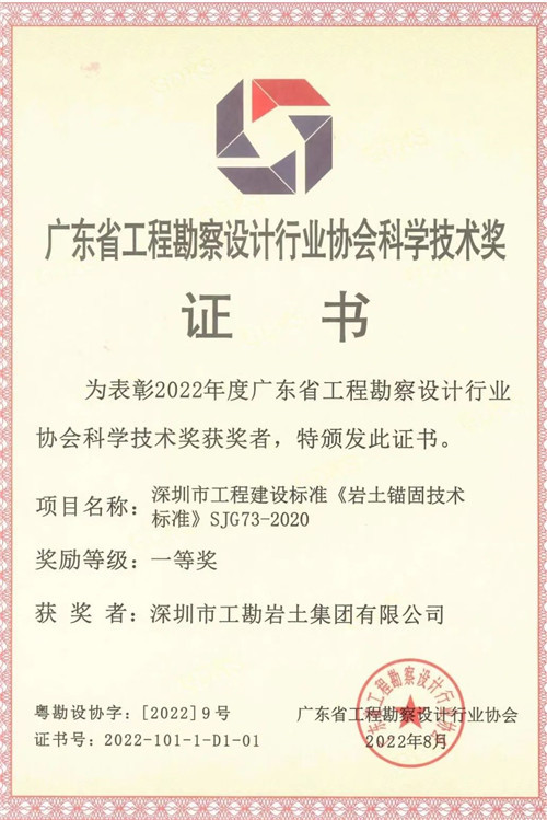 该标准由深圳市工勘岩土集团有限公司主编,于2020年经深圳市住房和建设局发布实施,应用于深圳市的建筑、市政、水利水电、矿业、交通、能源、港口、人防等工程建设各个领域与岩土锚固工程相关的勘察、设计、施工、试验、检测、监测、验收与维护全过程,解决了与锚固工程相关的工程建设不同行业之间的技术壁垒及矛盾。