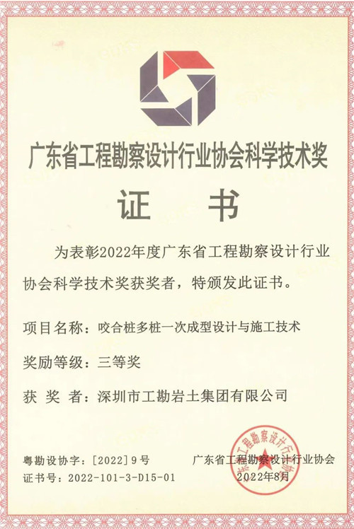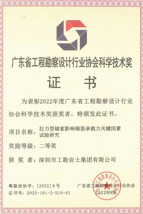 近日,2022年广东省工程勘察设计行业协会科学技术奖评选结果公布,深圳市潮汕青年商会名誉会长林强有的企业工勘集团3项成果获此殊荣。其中,“深圳市工程建设标准《岩土锚固技术标准》SJG73-2020”荣获一等奖;“拉力型锚索影响锚筋承载力关键因素试验研究”获二等奖;“咬合桩多桩一次成型设计与施工技术”获三等奖。