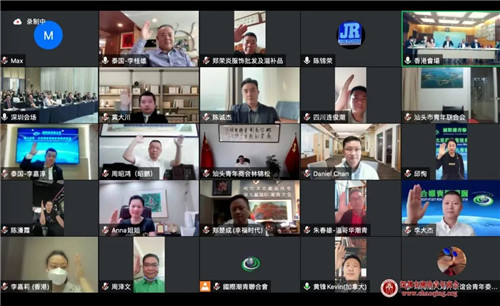 在全球视频会议上,国际潮团总会执行会长陈幼南,国际潮青联合会永远会长李桂雄、邱荣利、执行会长张俊勇、常务副会长李嘉淳、黄进达、陈亨达、陈诚杰,中国青少年研究会港澳台青年研究专委会主任陈咏华,汕头市委统战部副部长、市侨务局局长李鸿钊,共青团汕头市委书记曹安定,全国政协委员、香港潮州商会永远名誉会长兼当然会董胡剑江,香港潮属社团总会青年委员会执行主席章曼琪,香港潮州商会青年委员会主任委员柯家洋,澳门潮汕青年协会理事长刘智龙、会长孙耀宗,中华台湾潮汕同乡总会执行秘书李粤坚,泰国华人青年商会会长李嘉淳,马来西亚潮州公会联合会青年团总团长黄瑞雷,柬埔寨潮汕商会常务副会长刘理龙,阿联酋广东商会会长张钦伟,阿联酋潮汕总商会执行会长翁丹生,菲律宾粤商会会长林翰,英国潮汕商会会长李泽霖,加拿大潮商会副会长黄锋,温哥华潮州同乡会常务副会长兼青年委员会主席朱春雄,澳大利亚潮汕商会会长陈少伟,澳大利亚潮青会会长邱恂,上海潮汕商会常务副会长黄耀毅,上海潮汕商会青年工作委员会主席郑俊辉,上海潮汕青年联合会执行主席黄大川,浙江省广东商会会长许志鸿,珠海潮人海外联谊会青年委员会主席马志文,江门市潮资企业联谊会会长谢俊波,茂名市潮汕商会会长赖少伟,佛山市潮州商会执行会长陈漫霞,广东省地产商会青委会会长吴瑞奇,哈尔滨市广东潮汕商会会长郑楚成,广西海外潮人青年联合会会长孙镇生,兰州市潮汕商会会长庄宝豪,重庆潮人海外联谊会常务副会长李大杰,义乌市潮汕商会执行会长陈锦荣,汕头市青年商会会长林锦松,潮州市青年企业家联合会会长黄锋伟,潮州海外联谊会青年委员会会长黄武雄,揭阳市青年企业家协会副会长庄承杰,汕头市潮阳区工商联副主席李奕庄,汕头市潮南区工商联副主席周昭鸿等出席会议,并通过不同的方式为国际潮青的创新发展出谋献策。