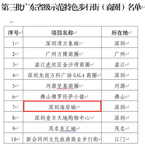 深圳海岸城荣登第三批省级示范特色步行街(商圈)认定名单