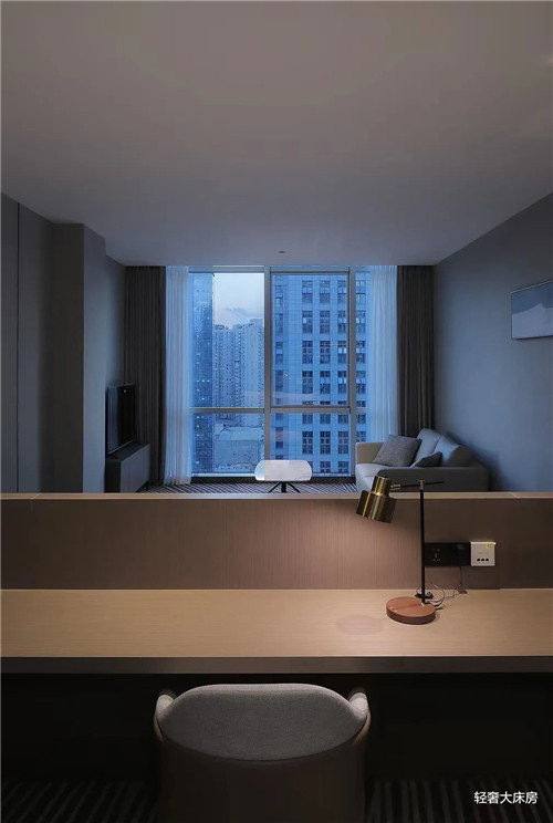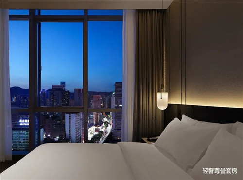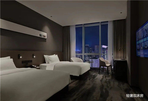 酒店150间客房及套房以轻奢雅致为主调,舒适的空间美学为宾客提供高级感体验。全景落地窗让宾客尽揽城市繁华,室内简约开阔的视觉感,搭配柔和的灯光设计,营造轻松氛围,置身其中,尽享至雅至静的沉浸体验。