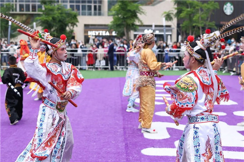 伴随着“咚咚锵、咚咚锵”的锣鼓节奏,令旗迎风挥舞,古装扮相的表演者手里的舞槌上下翻飞、对敲而舞,不时变换队形动作,大踏步前行。现场观看的市民跟随着锣鼓声和呐喊声,掌声此起彼伏、快门声络绎不绝。