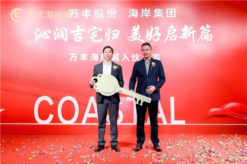 仪式在热烈的掌声中迎来了最激动人心的时刻——海岸集团代表陈波董事向万丰股份代表潘植波总经理交付万丰海岸城回迁房钥匙。一把钥匙代表了一个承诺,象征着万丰股民们即将开启更加品质、美好、便捷的幸福生活。