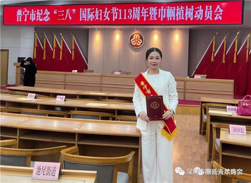 作为一名90后女性,深圳市潮汕青年商会理事陈曼曼坚韧创业,用信念编织梦想,将自己的珠宝事业经营得有声有色。同时,她秉承“收获于社会,回馈于社会”的理念,坚持参与爱心公益慈善活动,以巾帼不让须眉的气魄向大家展现了一名女企业家的责任和爱心。近日,陈曼曼被市妇联评为“普宁市三八红旗手”。