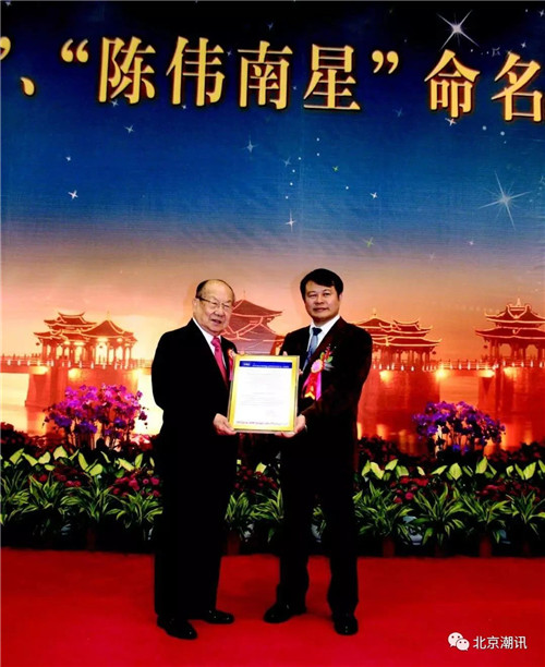 国家天文台台长严俊向陈伟南先生颁授“陈伟南星”命名证书和铜匾