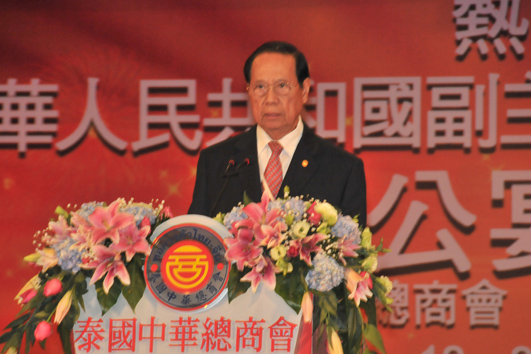 习副主席在发言中,从政治、经济、人文及灾后援助上表明了“泰中一家亲”,中泰两国是彼此信赖的好邻居、好伙伴、好亲戚。而且作为东盟诞生地及成员国的泰国,同中国与东盟区域间的经贸投资、基础设施见者、海上合作、可持续发展、社会人文等方面有着重要的作用和意义。他说:“2012年泰国将接任中国—东盟关系协调国,中方愿同泰方密切配合,携手推进中国—东盟关系和东亚合作,共同致力于促进亚洲的和平、稳定、繁荣”。他也对泰国华人华侨对中国的繁荣发展和泰国经济繁荣、社会进步做出的贡献表示赞赏,希望大家继承和弘扬优良传统,继续为中泰两国繁荣昌盛、为中泰友好事业代代相传作出新的更大贡献。